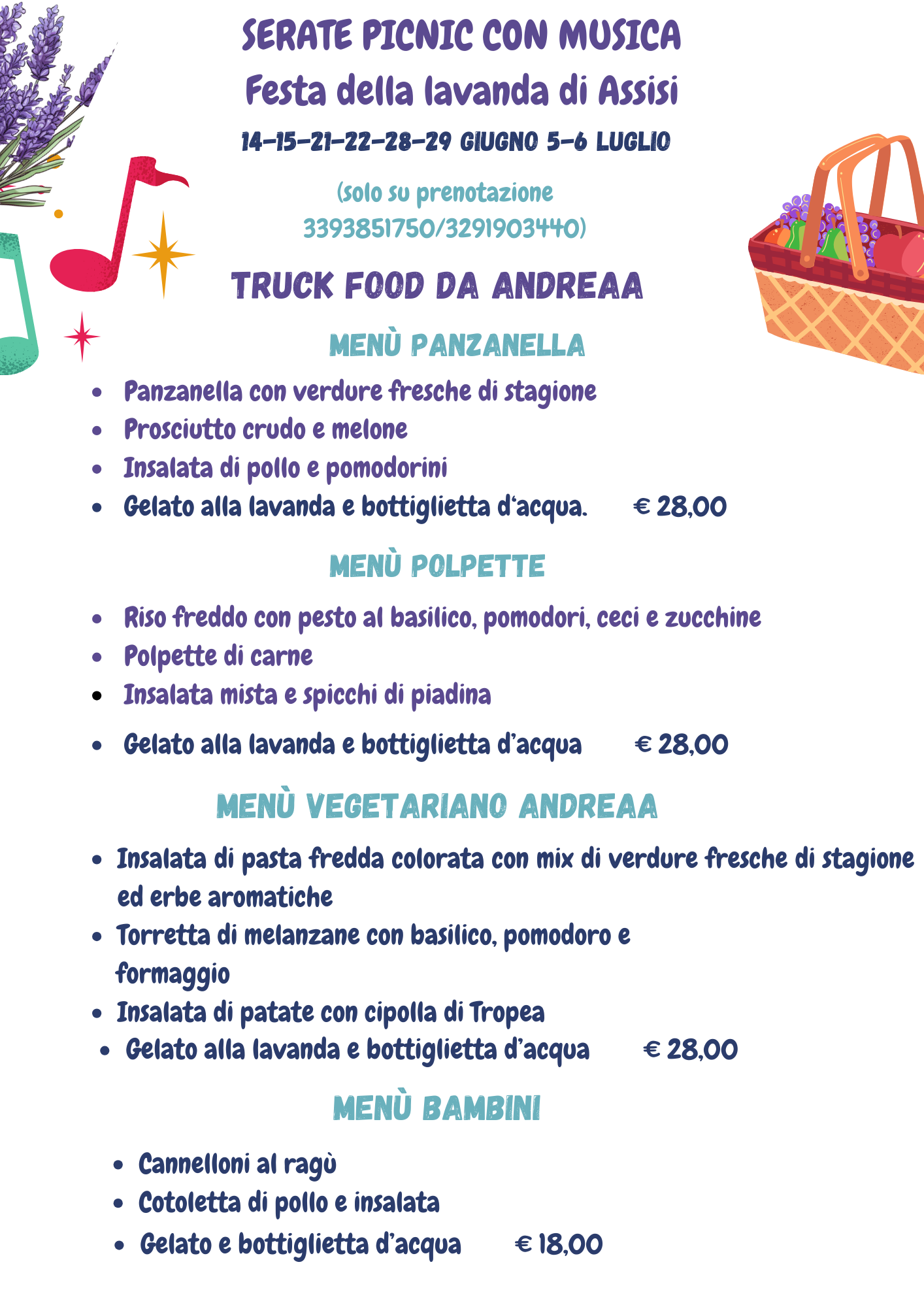 Picnic sia in terra con coperta e cassettina, che sui tavoli a vostra scelta per trascorrere qualche ora, al fresco, nella bellezza dell' ambiente che ci circonda. La cena sarà preparata da Truck Food, per farvi trascorrere una piacevole serata ed evitare spiacevoli file per poter mangiare, abbiamo pensato di preparare dei menù che dovranno essere prenotati in anticipo, 3 giorni prima dell' evento.