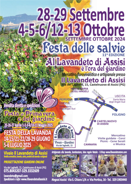 Festa delle salvie. Eventi Assisi 28-29 settembre 4-5-6 12-13 Ottobre. Nel mese di San Francesco d' Assisi organizziamo un evento dedicato alla natura e al giardinaggio. Vieni a fare una passeggiata e ad ammirare le stupende fioriture autunnali e a scoprire bellissime piante perenni a bassa manutenzione per per il tuo giardino e il tuo terrazzo. Mostra mercato di tutte le nostre collezioni di piante e del nostro artigianato alla lavanda. Ingresso gratuito